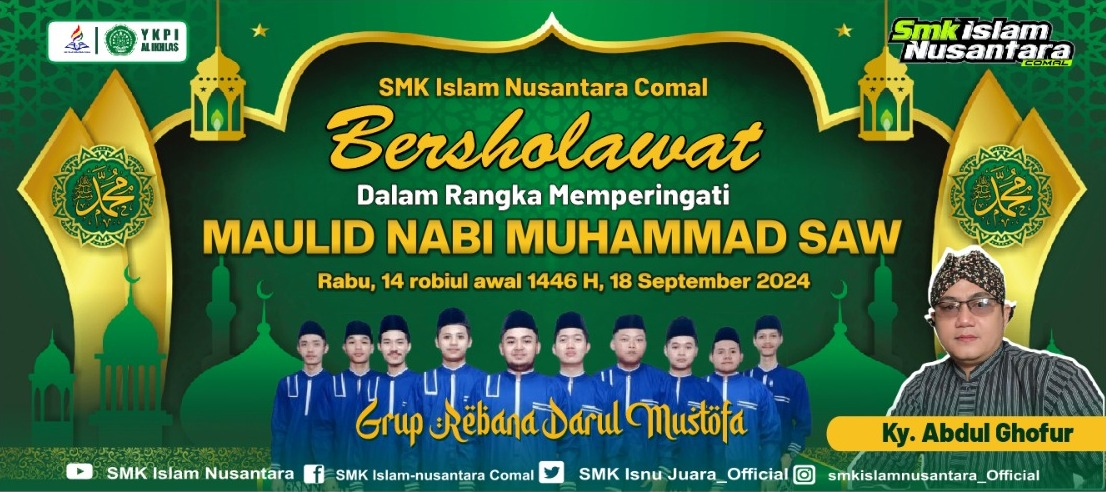 Baca artikel detiksulsel, "100 Ide Ucapan Maulid Nabi 2024. Dalam Rangka menyambut Maulid Nabi Muhammad 2024 SMK Iswlam Nusantara Comal melaksanakan kegiatan Isnu Bersholawat dengan pembicara Bpk Kyai, Abdul Ghofur dari pemalang dan grub rebana Darul Mustofa
